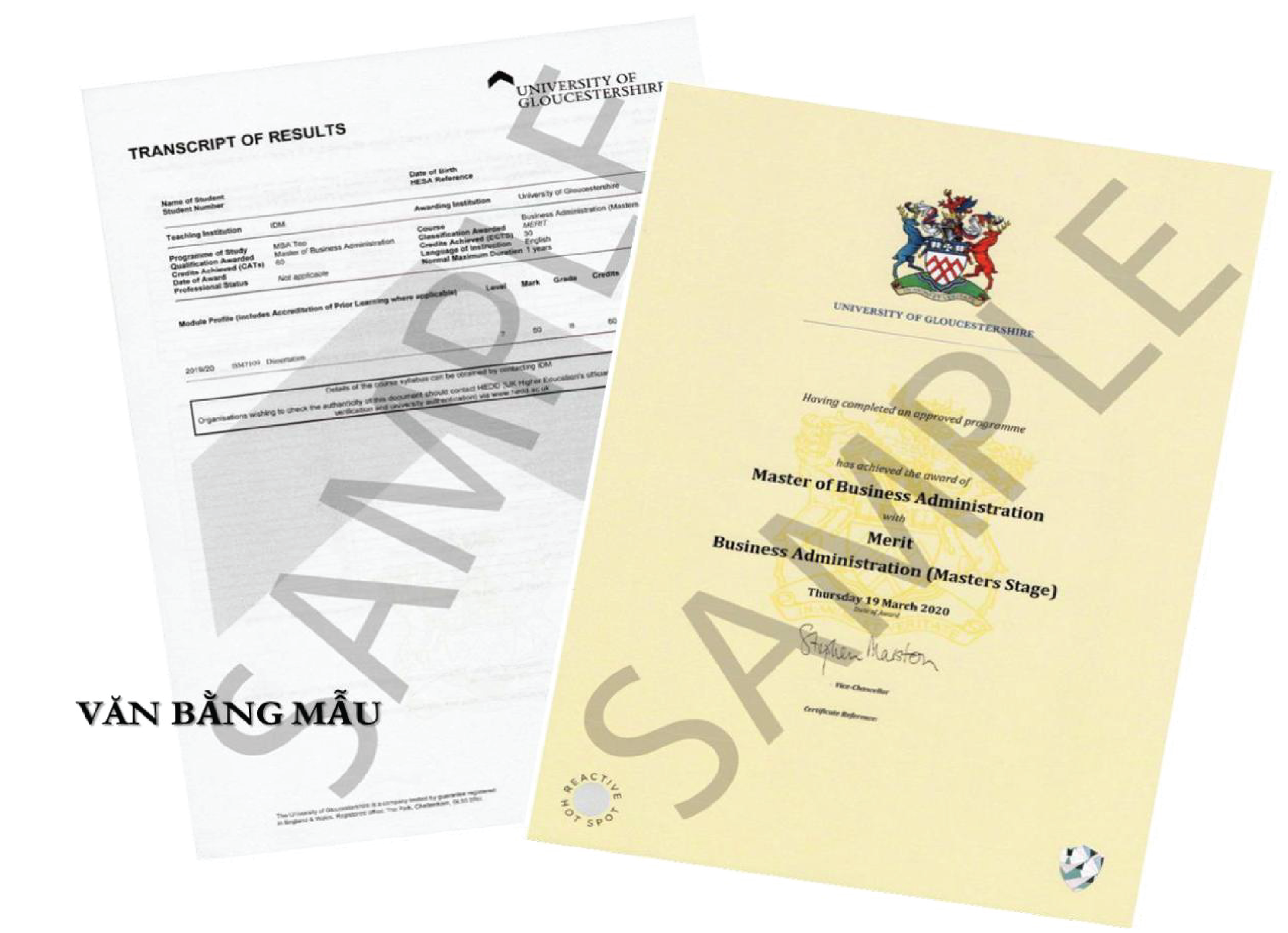 Requirements:Students complete 60 credits of the Advanced Master's Degree in Year 2 at the University of Gloucestershire, UK and receive an MBA Degree with the form of Study on-campus in Vietnam or Study on-campus in the UK at the University as shown in the following Diploma sample:
