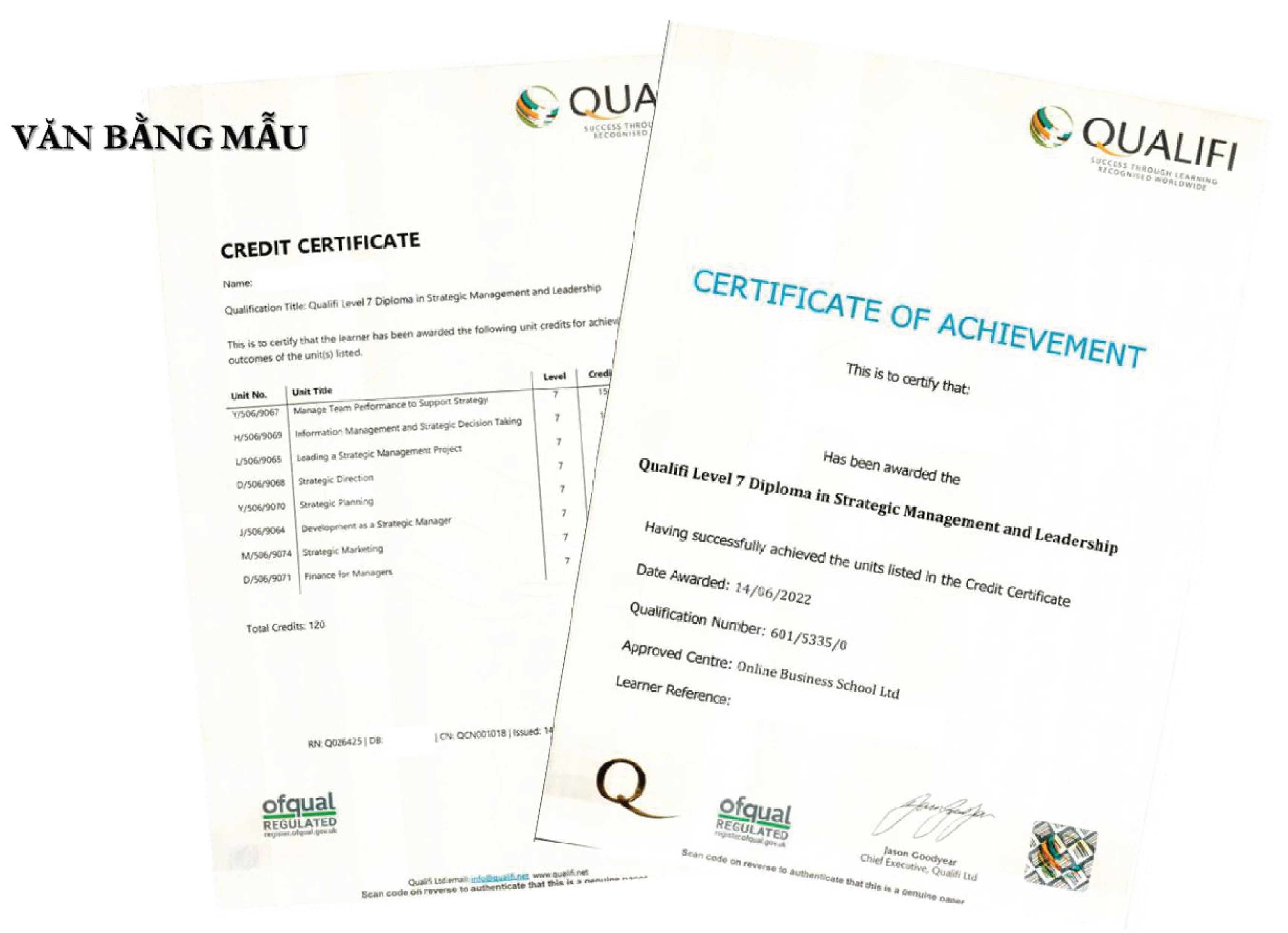 With 30 modules to complete 08 Thesis topics, achieving 120 UK credits - equivalent to Year 1 of Master's Degree in the form of Study Abroad in Vietnam. Upon completion of the program, students will receive a QUALIFI Level 7 Diploma for Phase 1 as shown below: